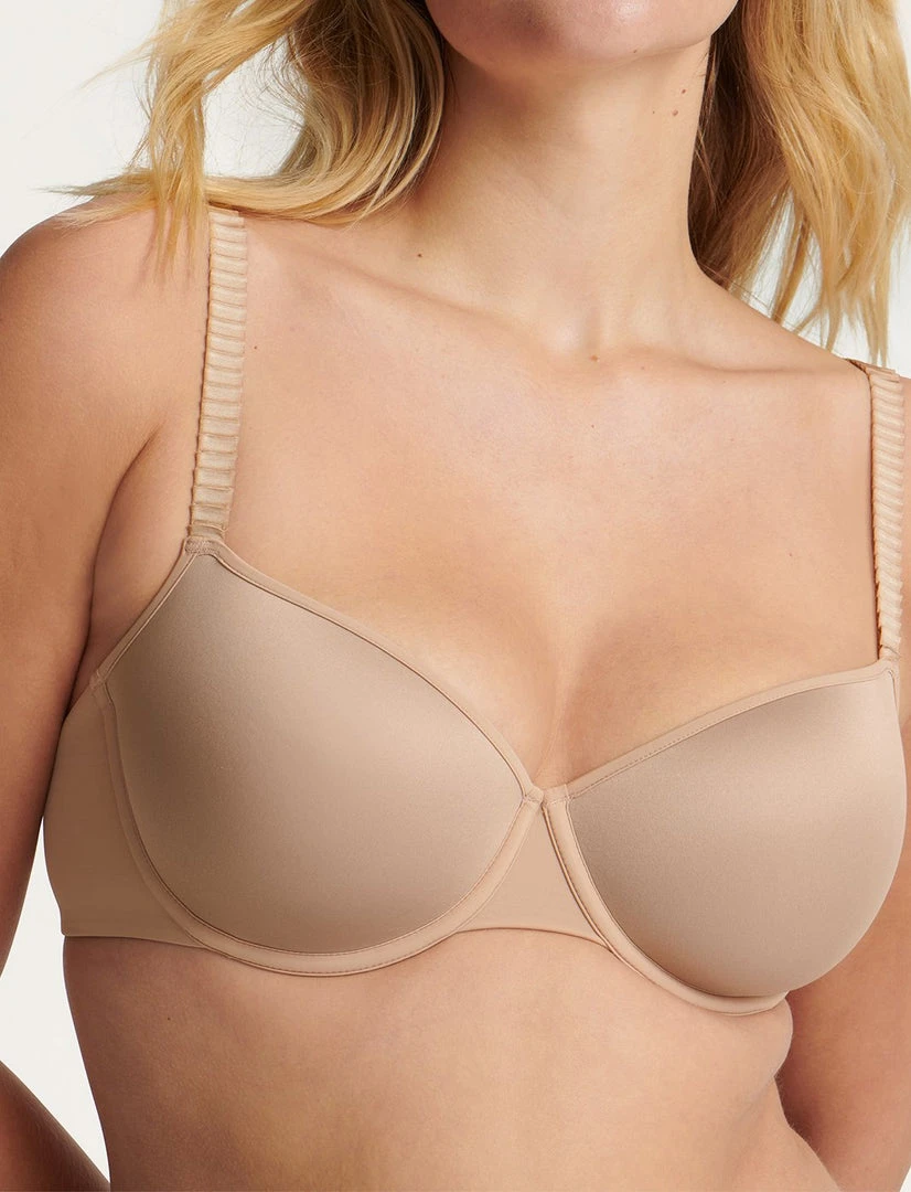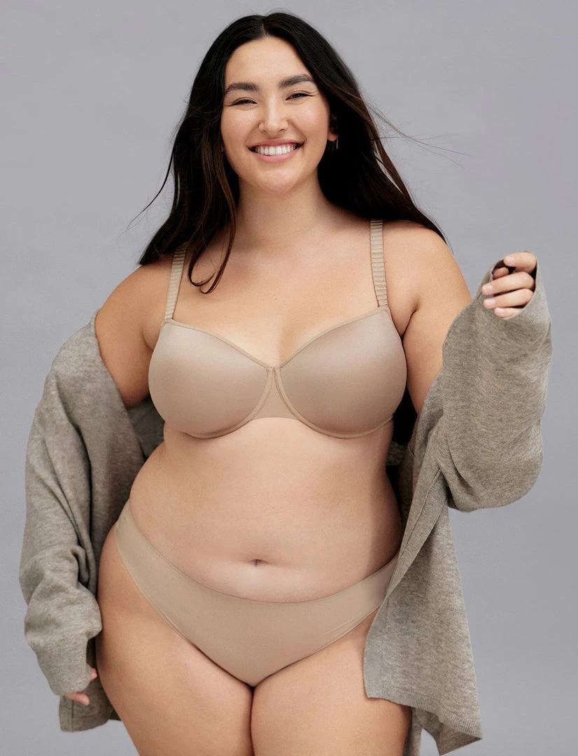 - T-shirt bra: A–H plus half cup sizes; demi coverage; memory foam cups with coated, nickel-free underwire; no-slip adjustable straps; padded hook and eye closure