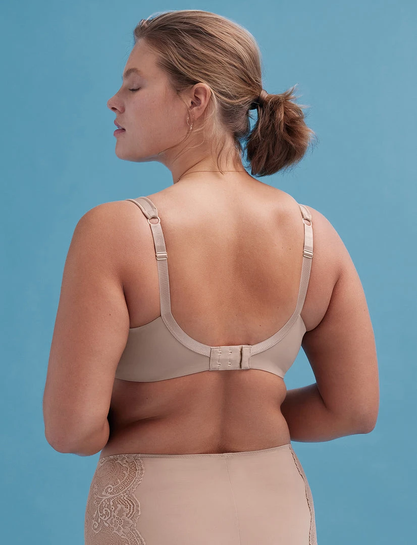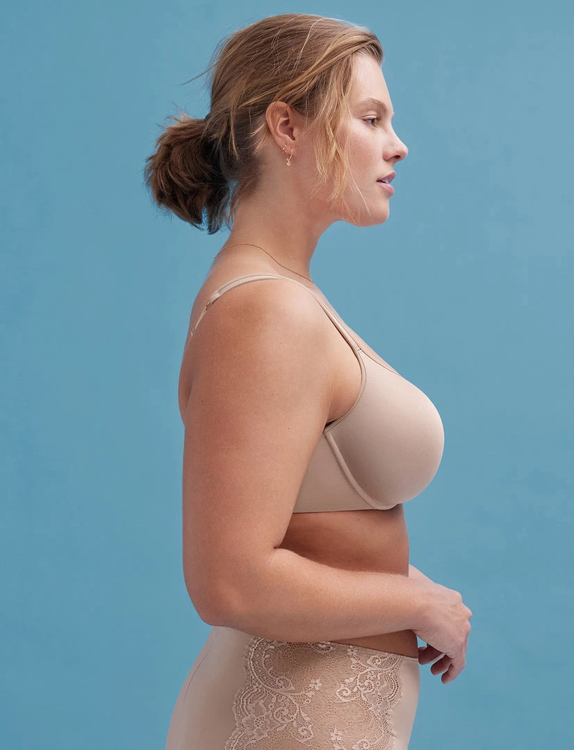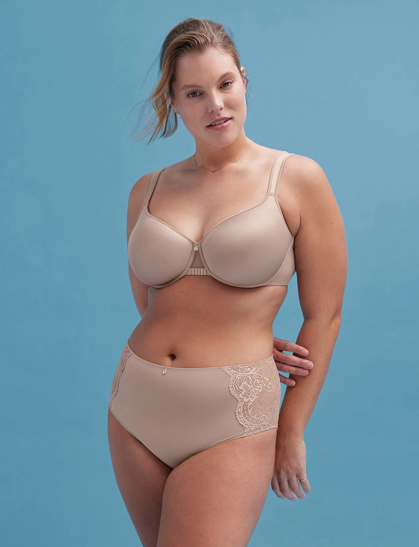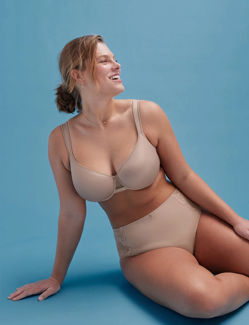 Major support and coverage for a more modest look. Wide, comfy straps stay in place and won’t dig in. Super smoothing, no overflow.
