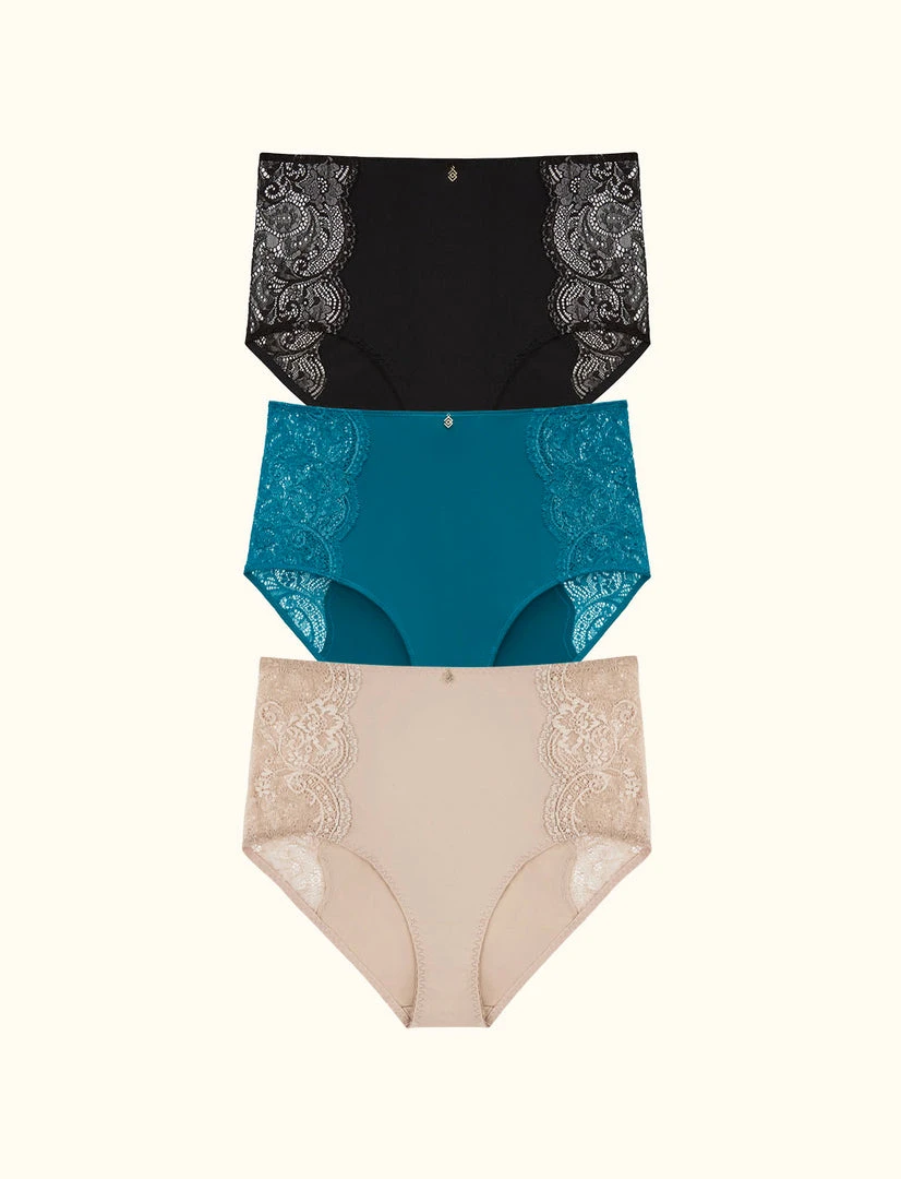 Includes three pairs of our Lace High Brief underwear. A modern take on vintage style, perfect for daily wear, date night, or no-pants partying at home.